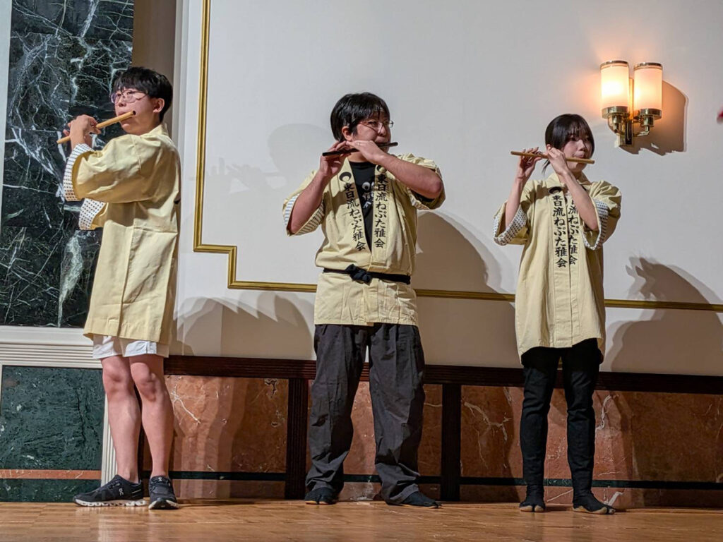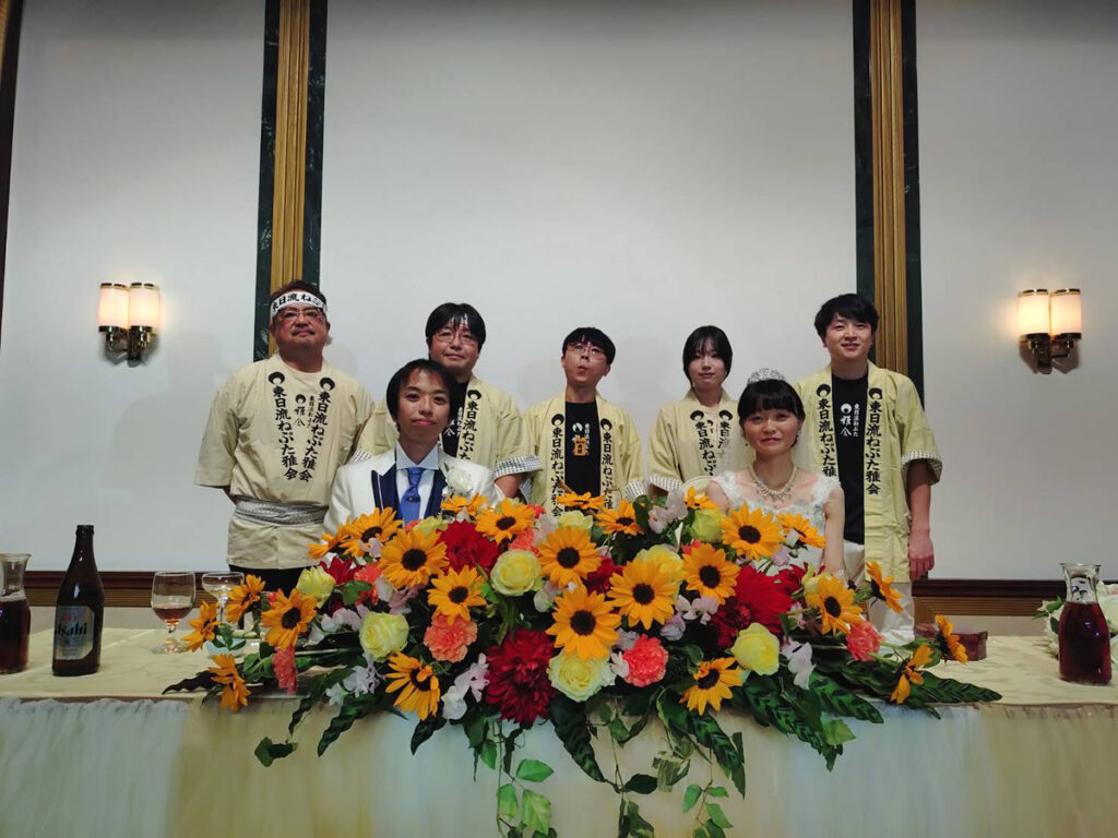 結婚式余興 ねぷた囃子 披露! その他 X Facebook コピー 2025.11.24 日頃より当ねぷたの活動にお世話になっている方より、結婚式の余興にねぷた囃子演奏の依頼があり、23日(日)に披露してきました! まずは太鼓の準備からです! 余興開始前の余裕?の皆さん(^^) お囃子演奏始まりました。県外からお出での方も多いとのことでしたが、間近にお囃子に接して楽しめたでしょうか? 最後に新郎新婦と記念写真。末永くお幸せにどうぞ!